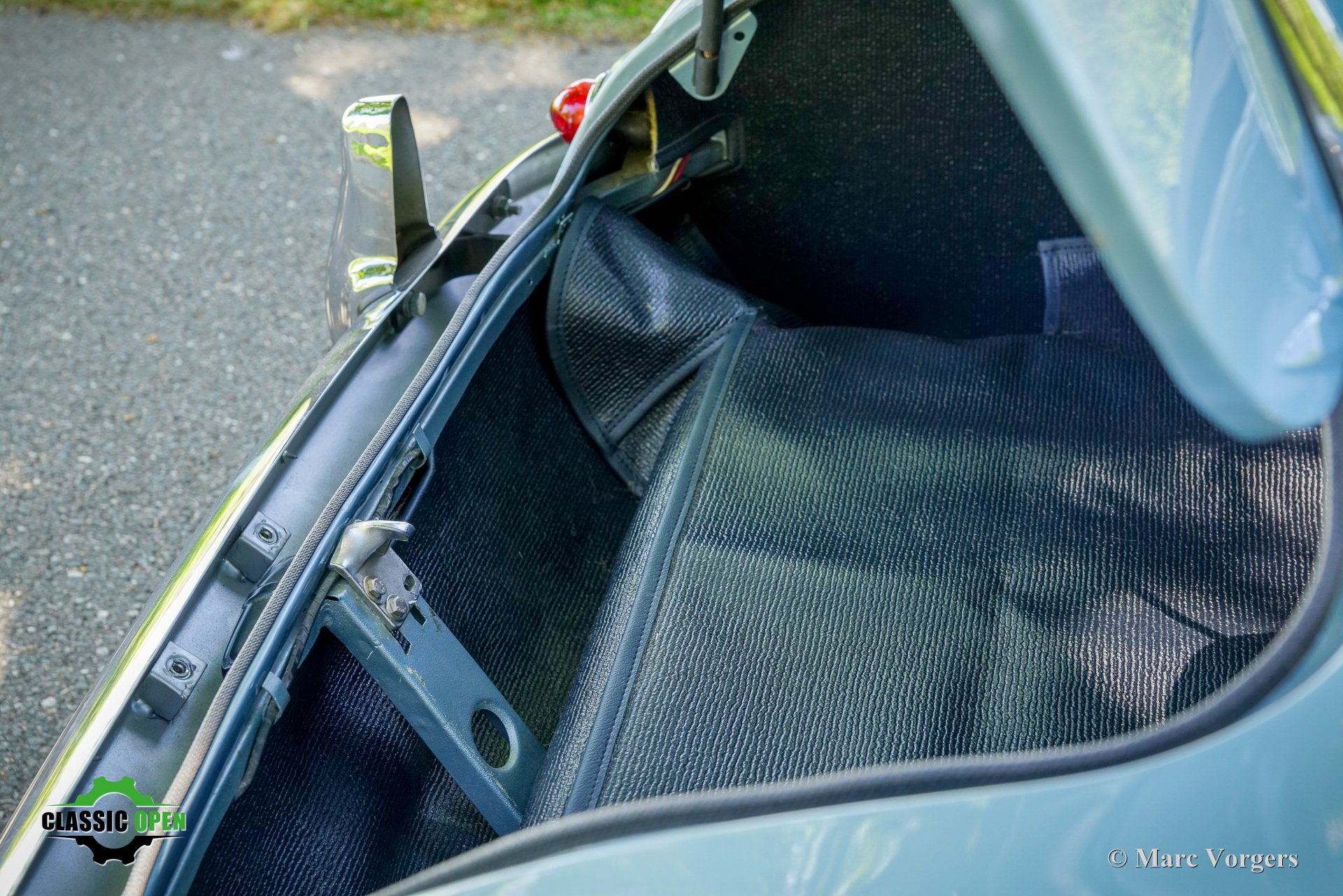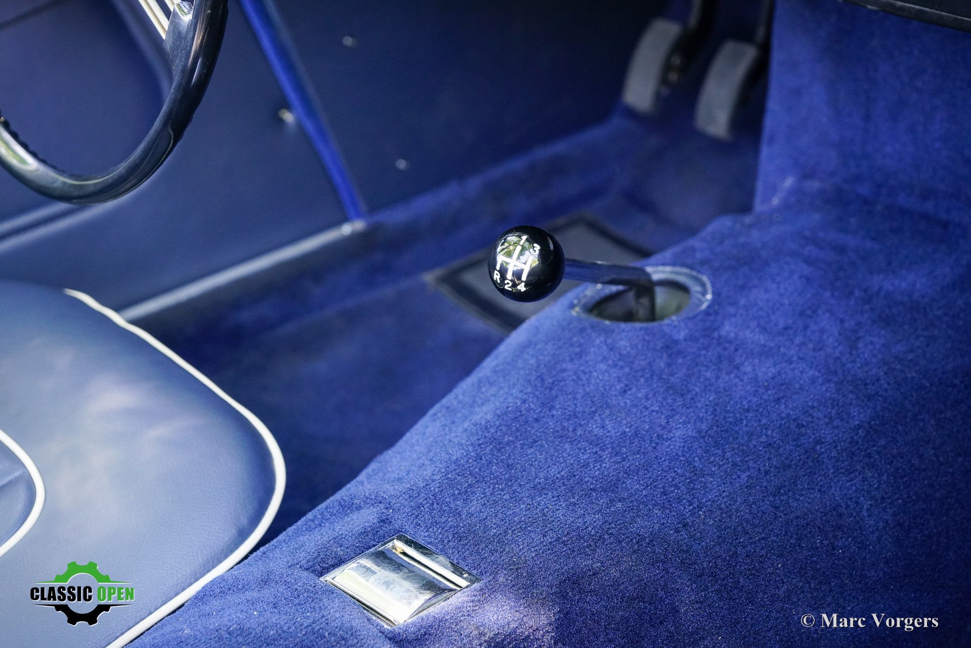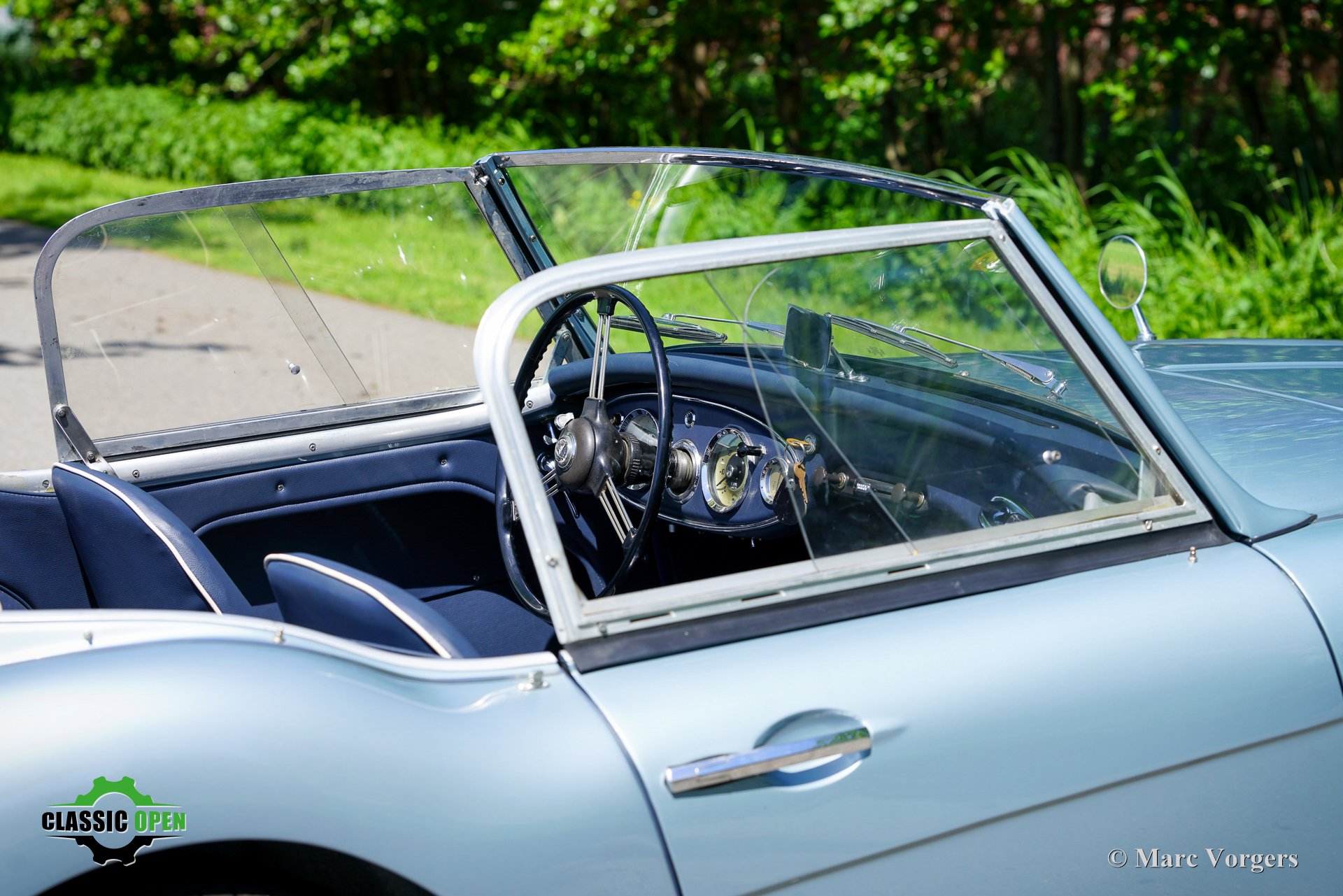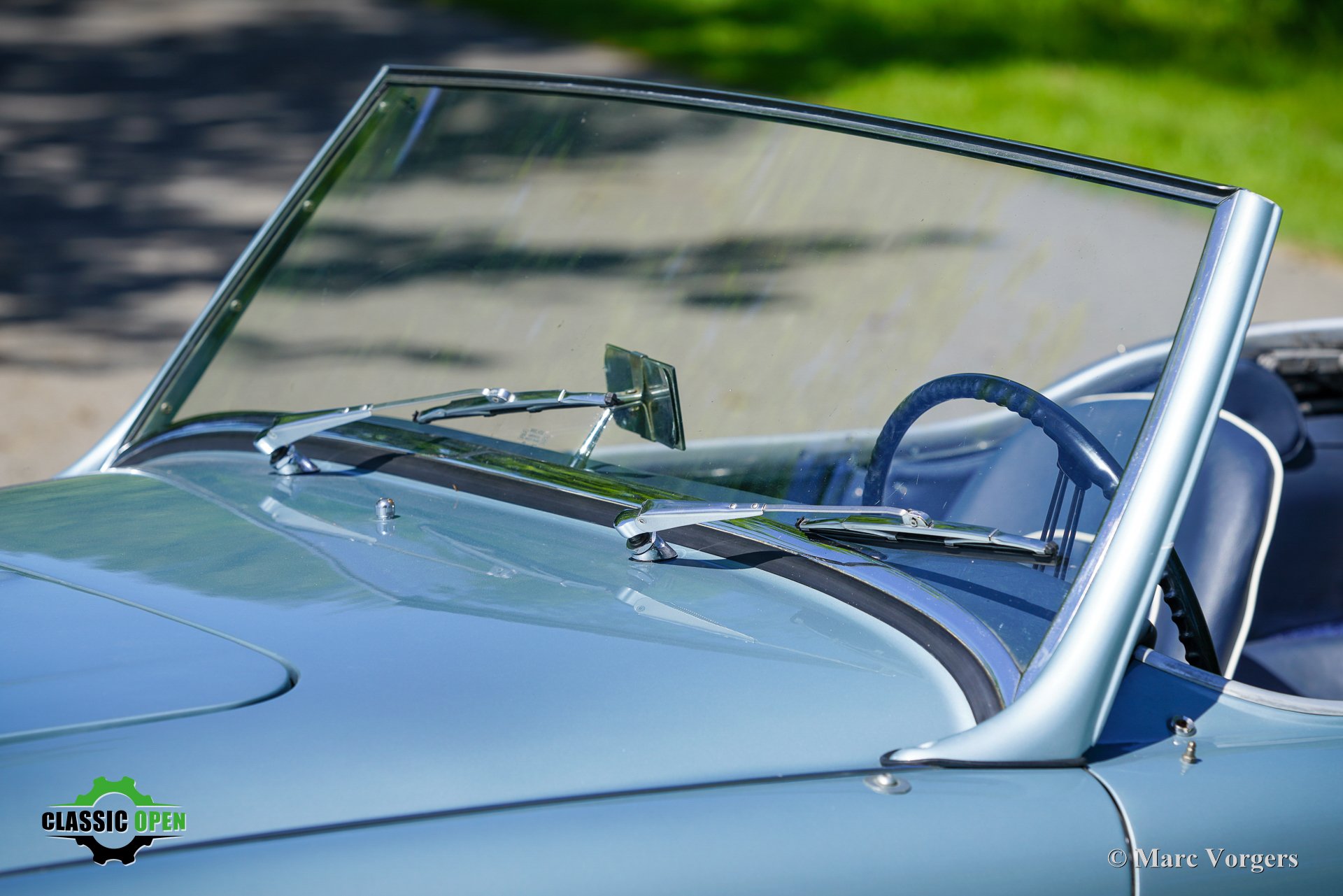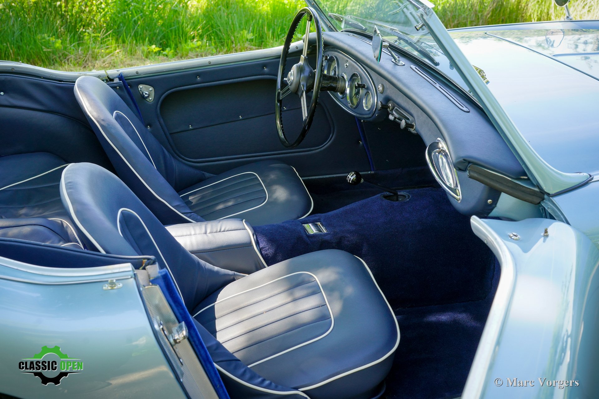 Exterieurkleur: ijsblauw metallic gecombineerd met een donkerblauw lederen interieur met witte biezen en donkerblauw tapijt. Zwarte soft-top en aluminium zijruitframes.