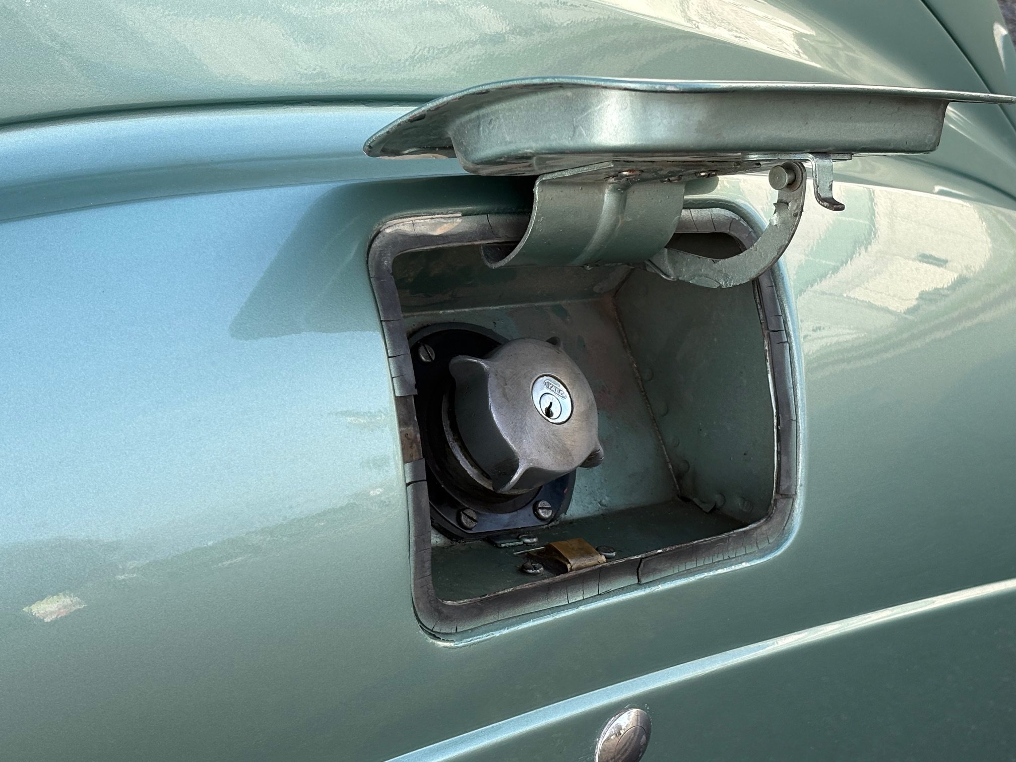 Licht groen (Lugano Blue) metalic met een beige leren interieur.
