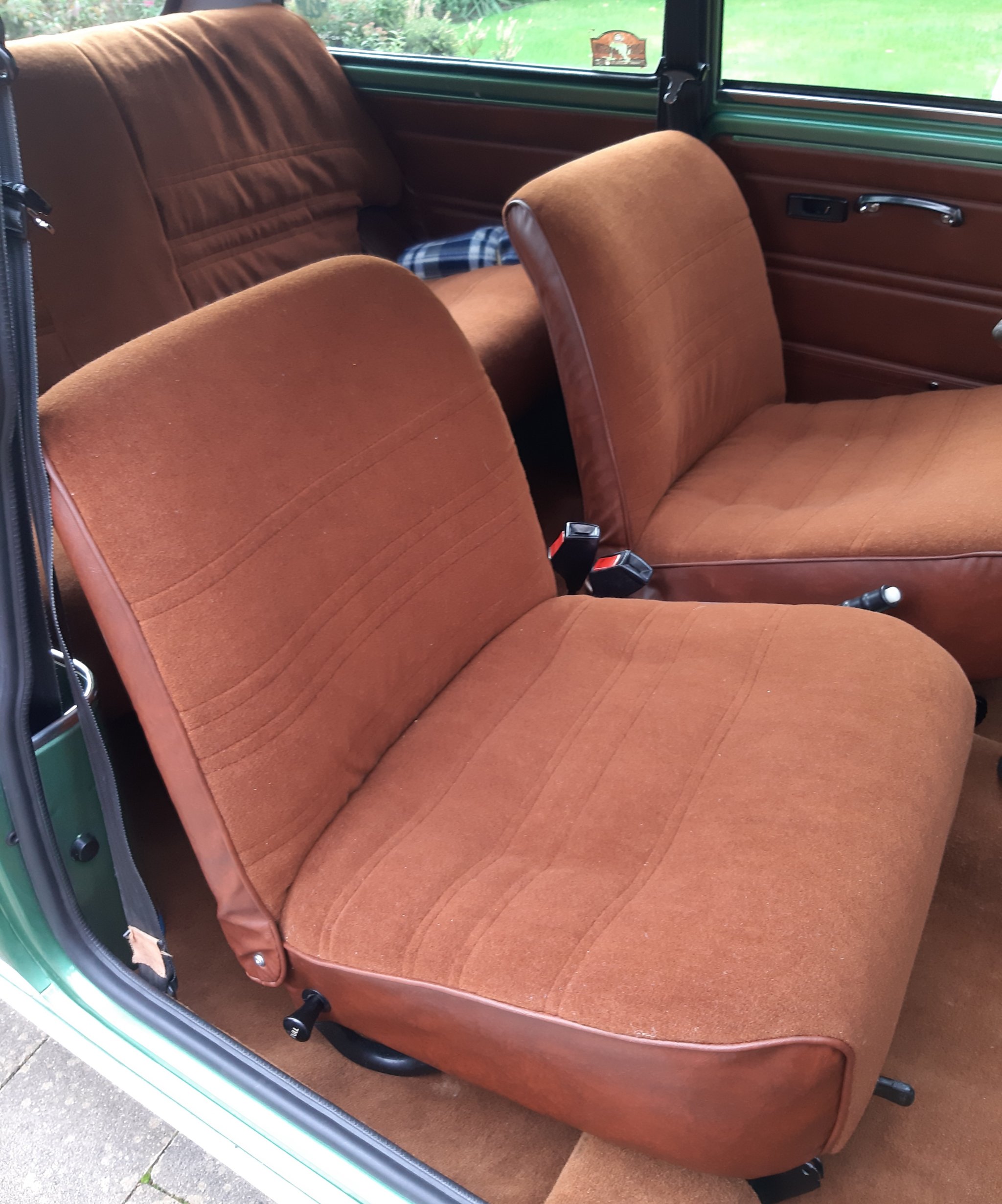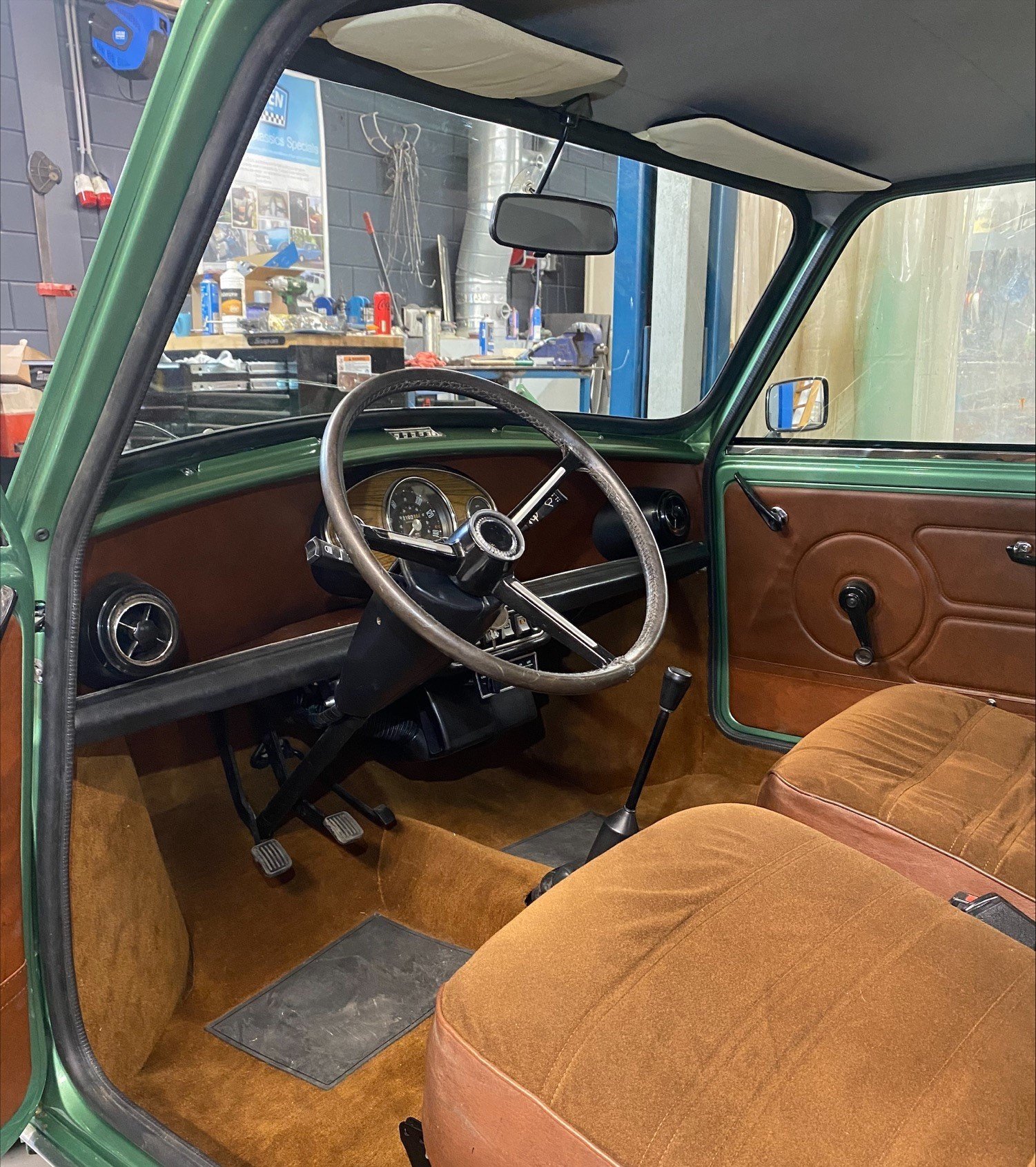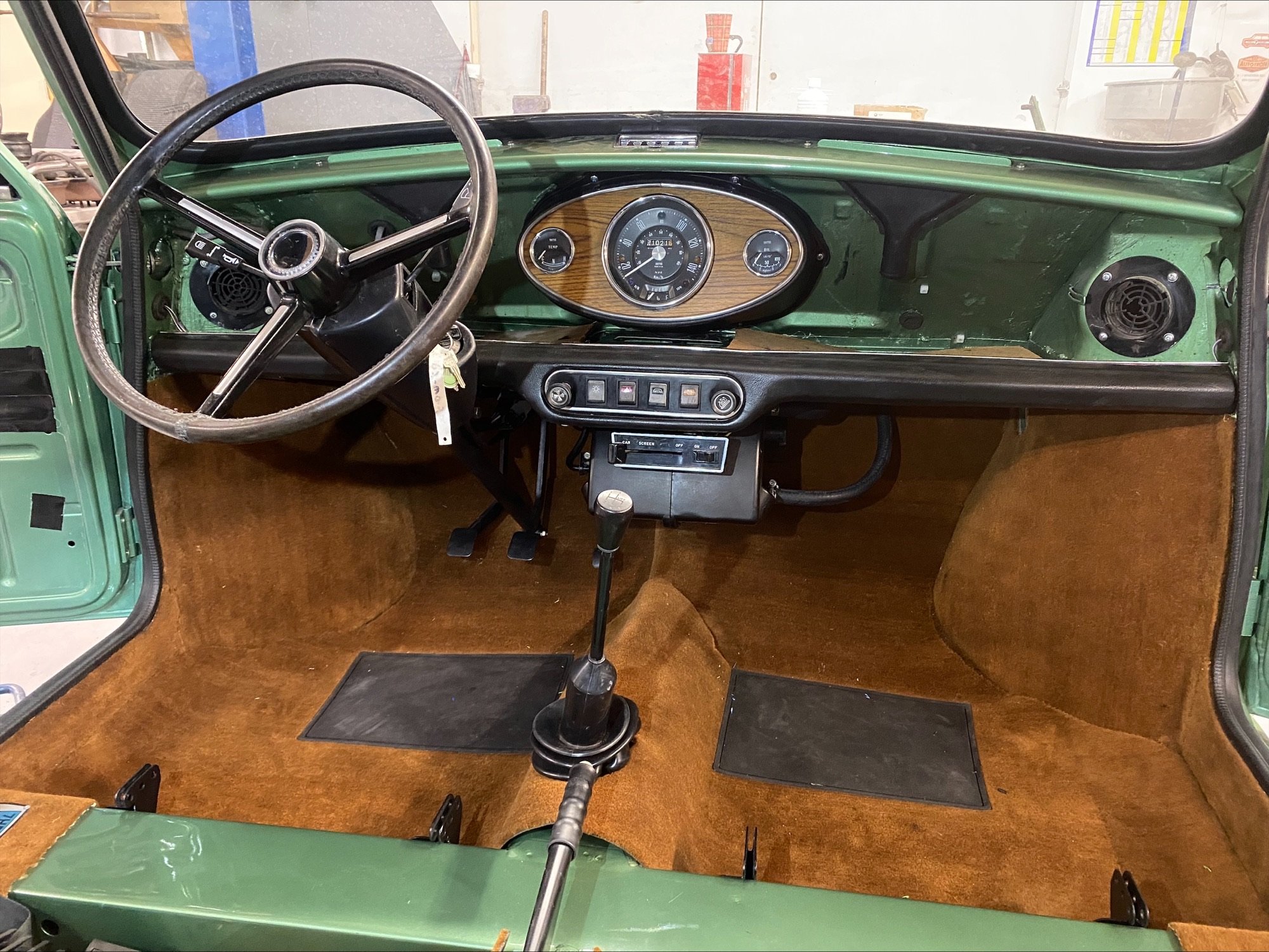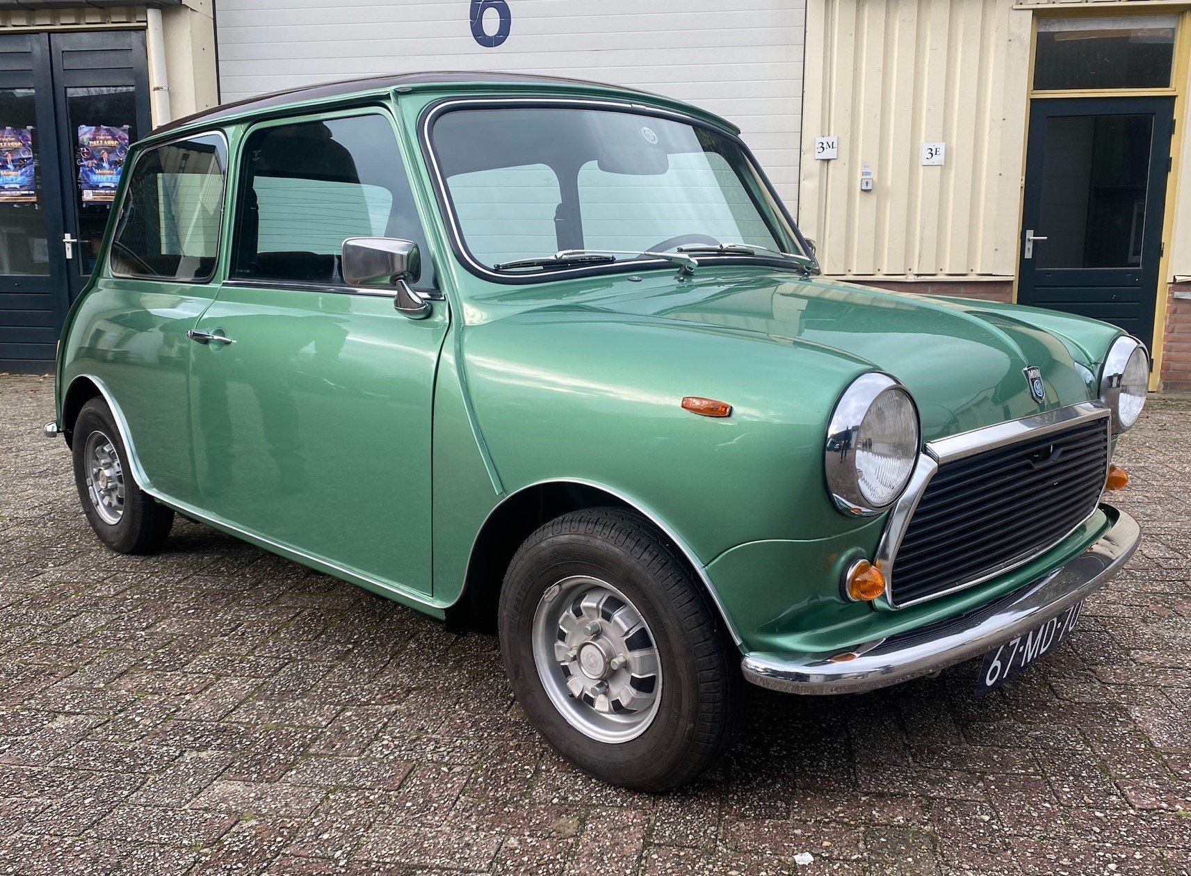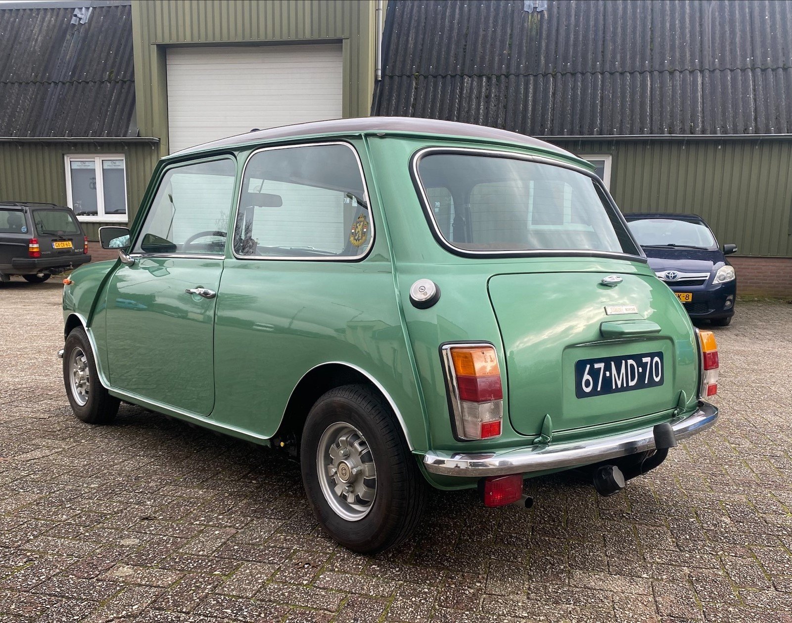 Deze licht-groene Special 1100 werd in België geassembleerd en daar voorzien van een bruin gespoten dak en een bruin stoffen interieur. Vervolgens is deze Mini nieuw in Nederland geleverd.