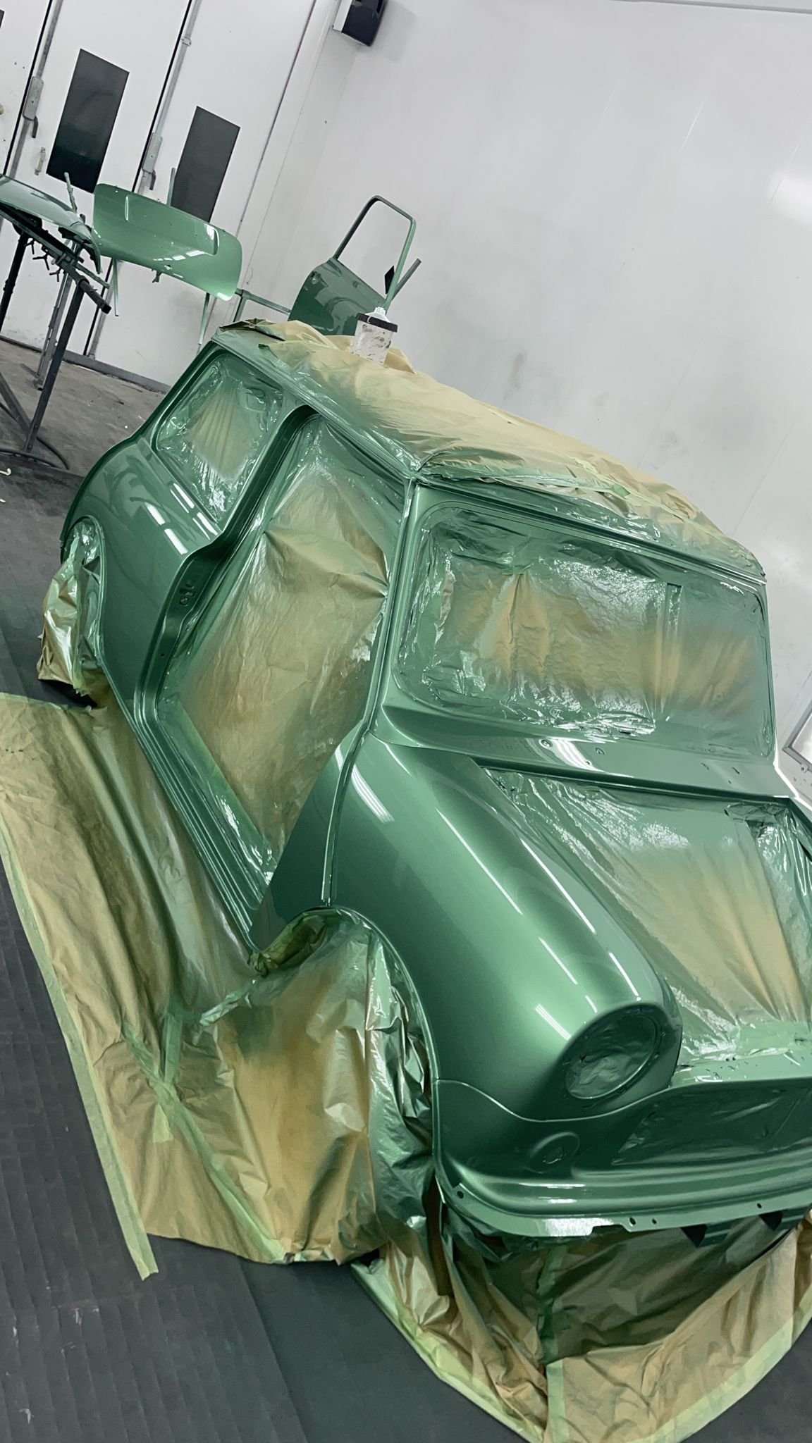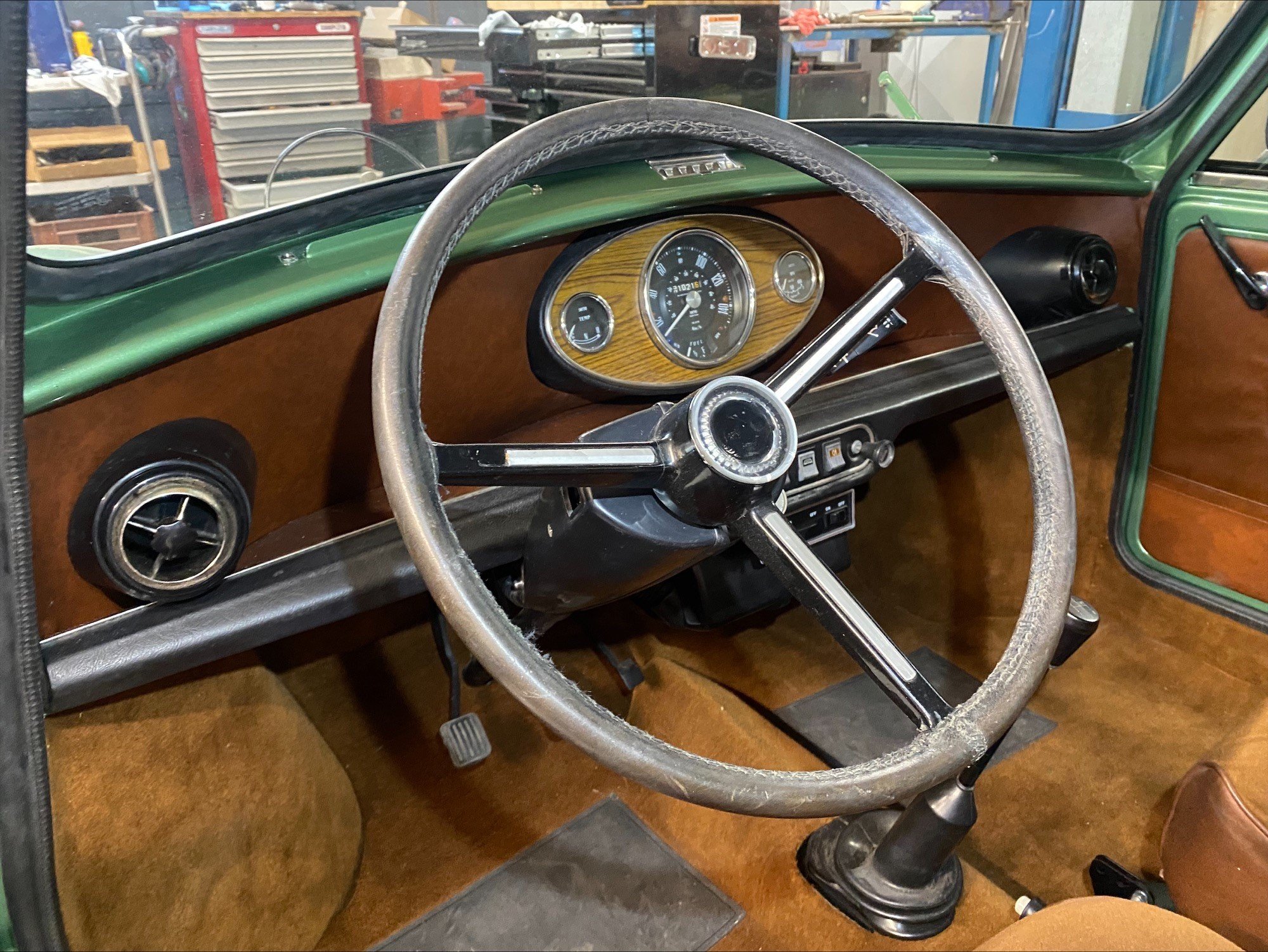 Groen metalic met een bruin gespoten dak en een bruin stoffen interieur.