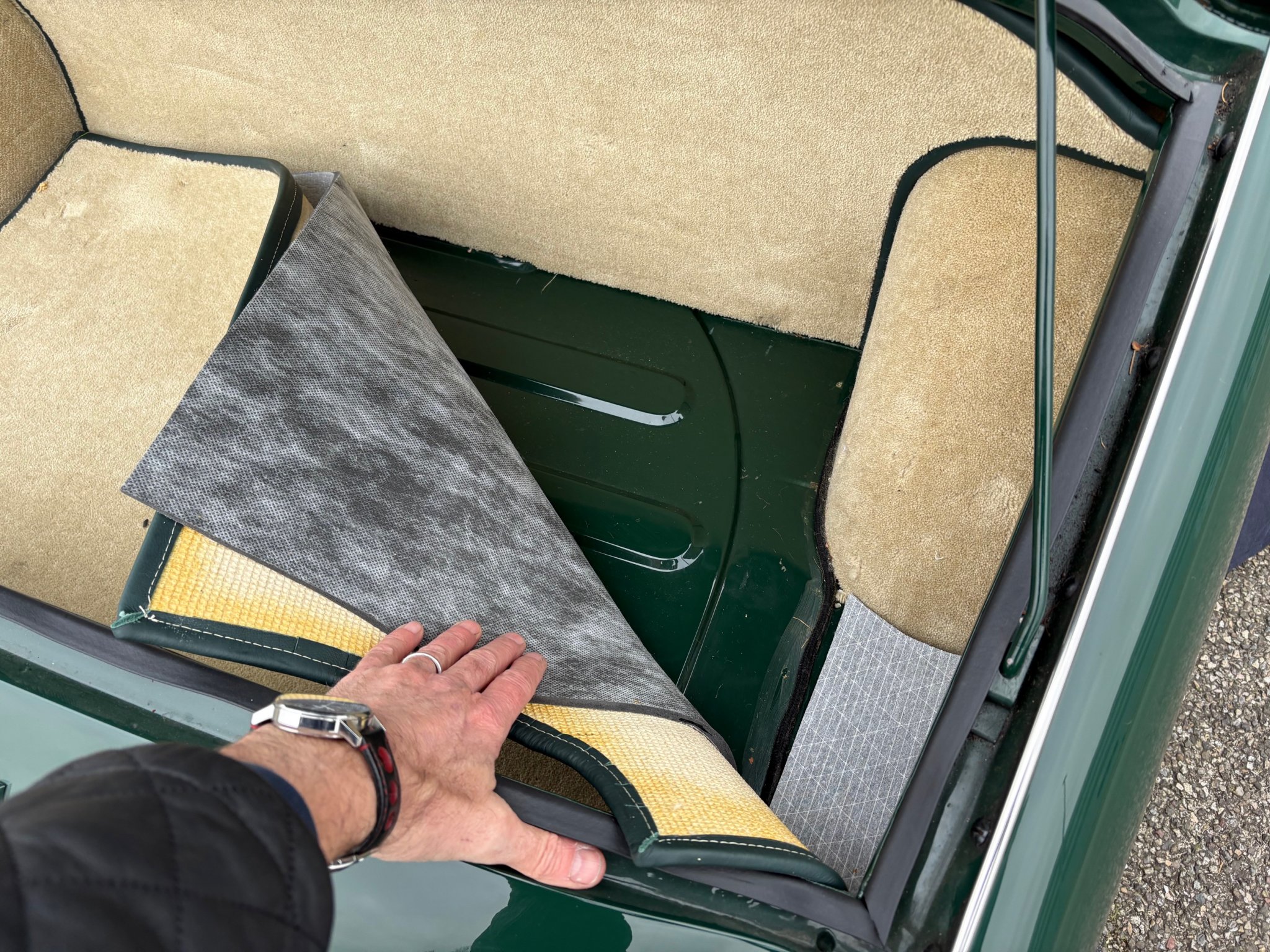British Racing Green met een beige leren interieur en een beige soft-top.