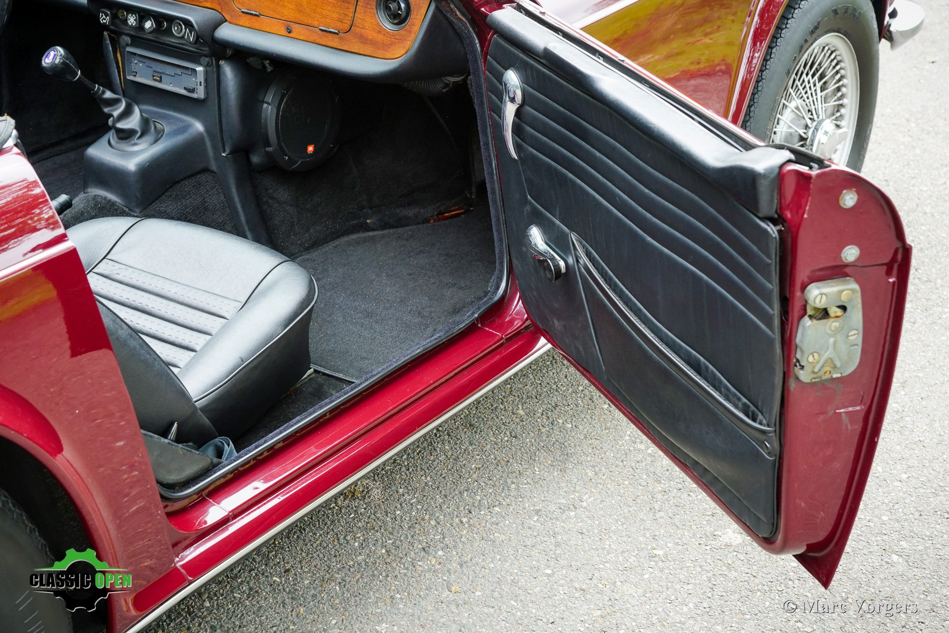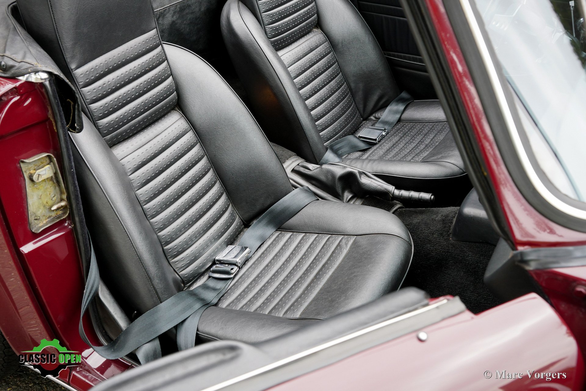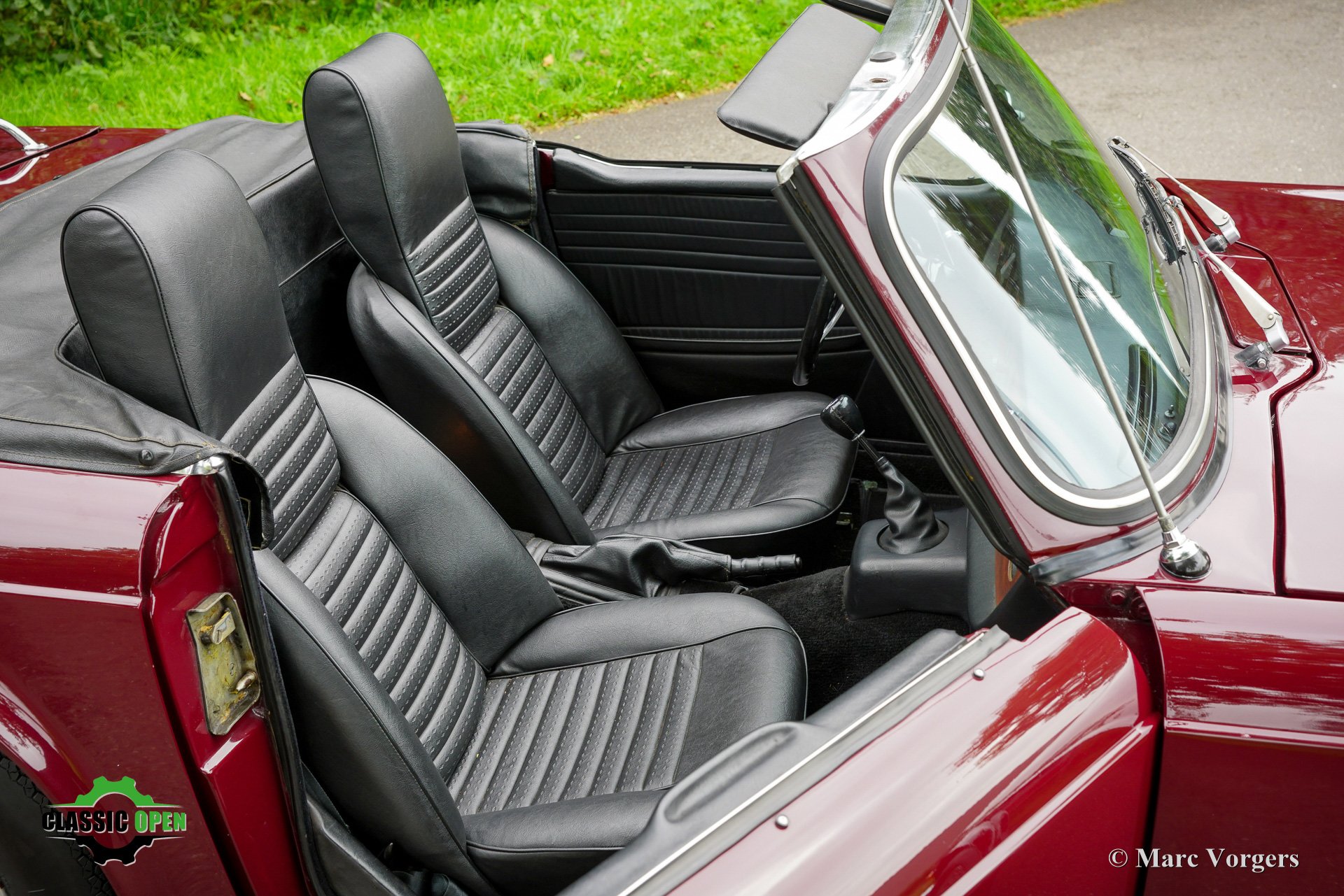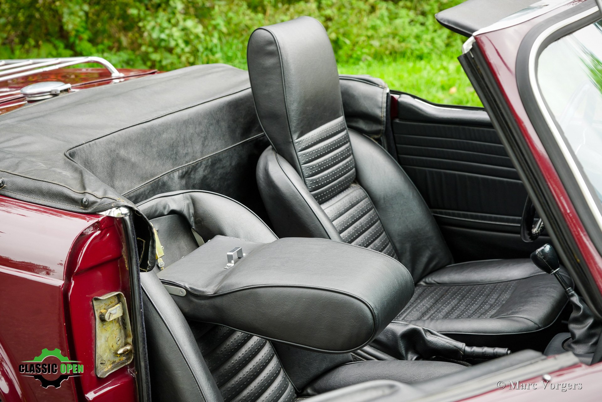 Carrosserie uitgevoerd in donkerrood (Damson) gecombineerd met een zwart kunstlederen interieur, zwart tapijt, een zwarte mohair soft-top, en een zwarte vinyl kapafdekking.