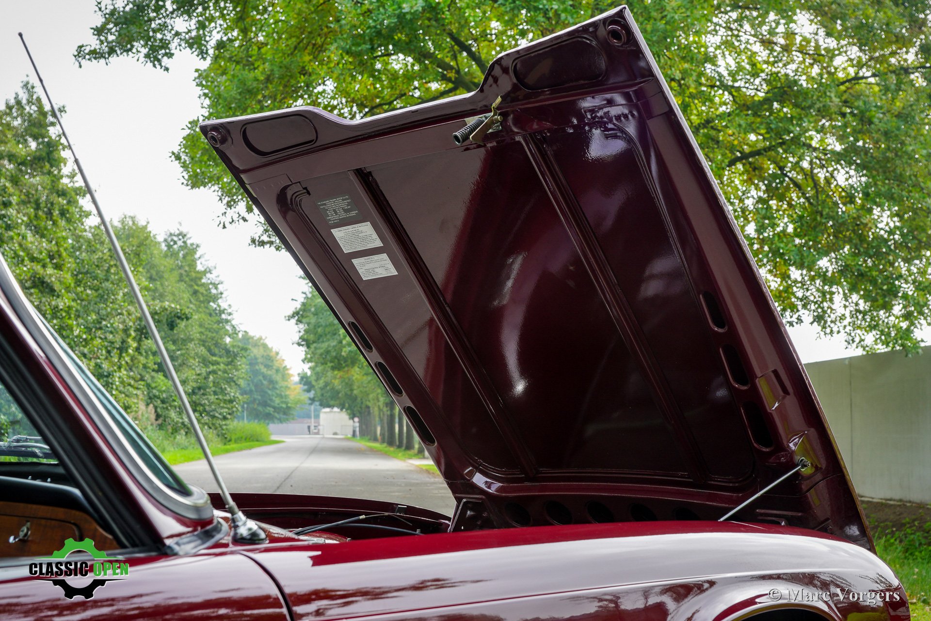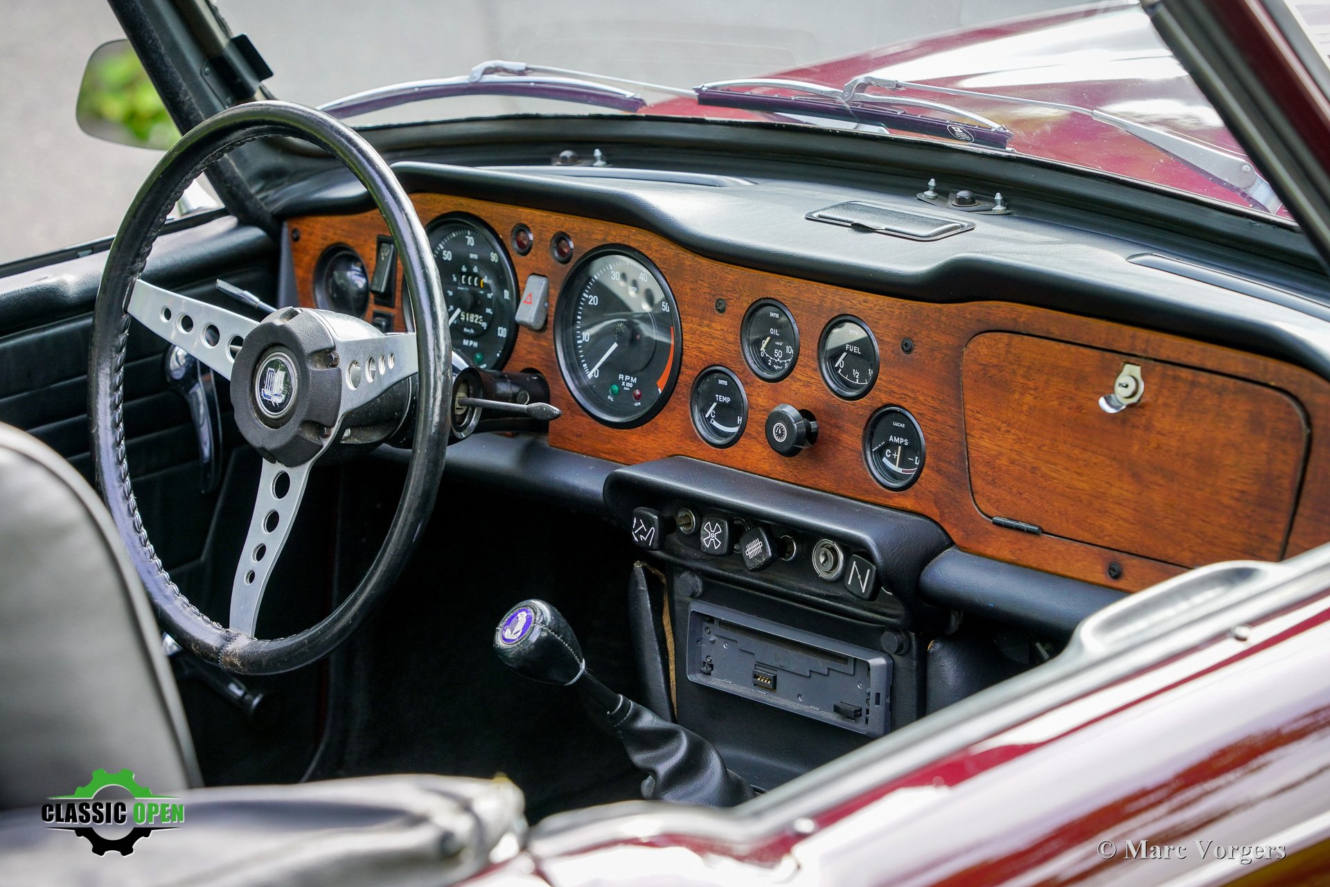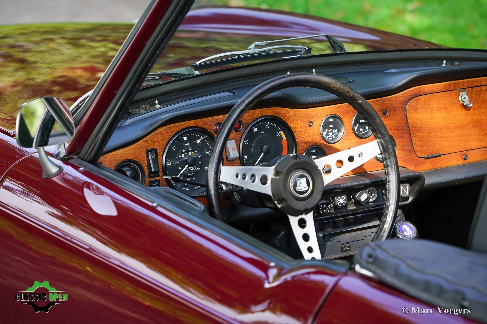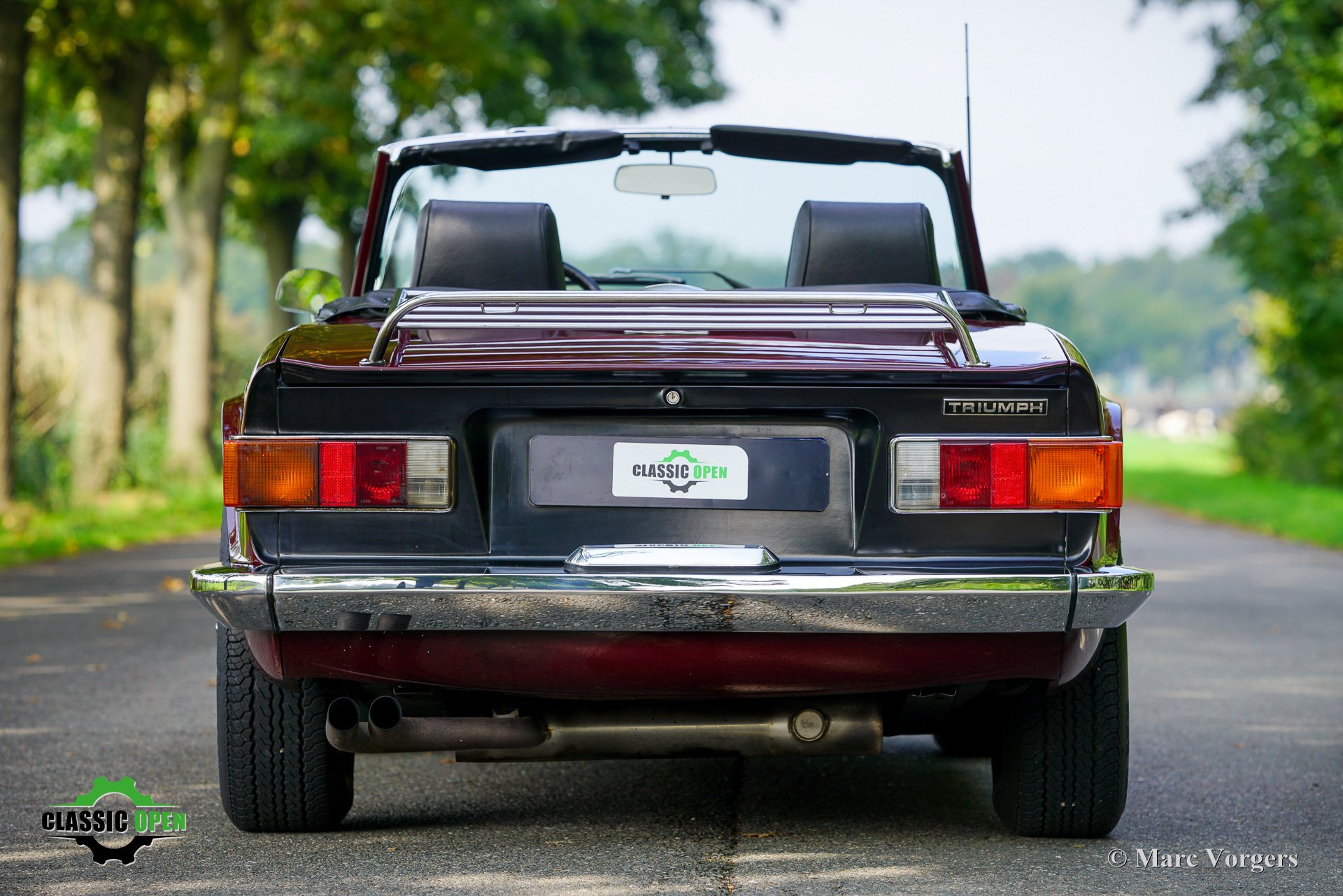 Carrosserie uitgevoerd in donkerrood (Damson) gecombineerd met een zwart kunstlederen interieur, zwart tapijt, een zwarte mohair soft-top, en een zwarte vinyl kapafdekking.